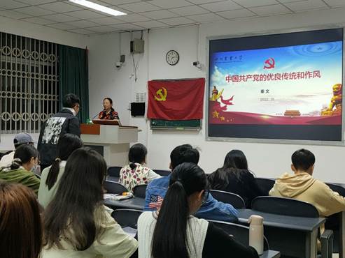 秦文教授从党的优良作风的形成与发展过程、党的优良作风的主要内容、新时代党的作风建设与巨大成就三个方面入手,生动讲述了中国共产党的优良传统和作风。坚持理论联系实际、密切联系群众、批评与自我批评这三大优良作风对于中国共产党来说十分重要,是党能战胜一切困难,是我们党的立身之本。秦文书记指出,作为新时代青年、作为入党积极分子,一定要居安思危,增强忧患意识,充分认识弘扬三大作风的重要意义和在此过程中取得的伟大成就。