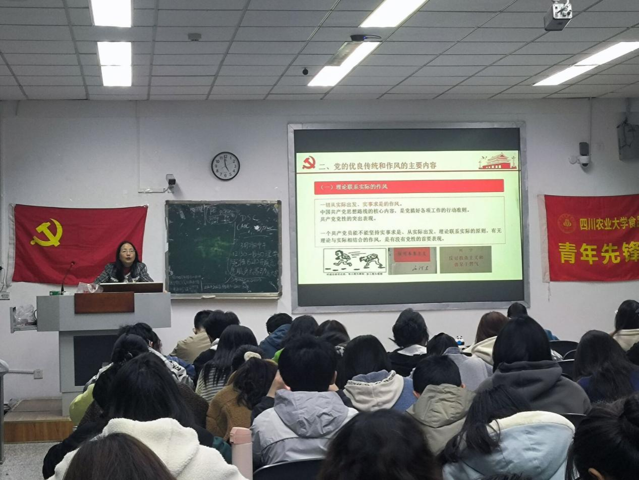 秦文教授以《中国共产党的优良传统和作风》为主题,从“作风”两字出发,提出作风即做事的态度和行为,进而引出了“党的优良作风是党的生命,需要我们好好继承和弘扬”的中心思想,并结合食品学子、驻村干部、驻村书记三种身份面对的不同挑战进行提问,引起入党积极分子的思考。随后,秦文教授从党的优良作风的形成与发展过程、党的优良作风的主要内容、新时代党的作风建设与巨大成就这三个方面授课,加深了入党积极分子对党的优良作风的认识。秦文老师从初步形成阶段、基本形成阶段、曲折发展阶段、调整改进阶段、全面发展阶段五个阶段入手,结合自我成长的经历,描述了“理论联系实际、密切联系群众、批评与自我批评”这三个党的优良作风逐渐形成的过程,体现了党的优良作风是经历实践检验的真理。同时,秦文教授以新时代党的作风建设中的“八项规定”和“四风问题”整治为主进行了详细的介绍,说明了党对建设优良作风的重视以及入党积极分子应该端正做事的态度和行为、树立良好作风。最后,秦文教授以“作为入党积极分子如何继承和弘扬党的优良作风”这一问题结束授课,希望能够以此来鼓励入党积极分子在未来生活中能够有所行动。
