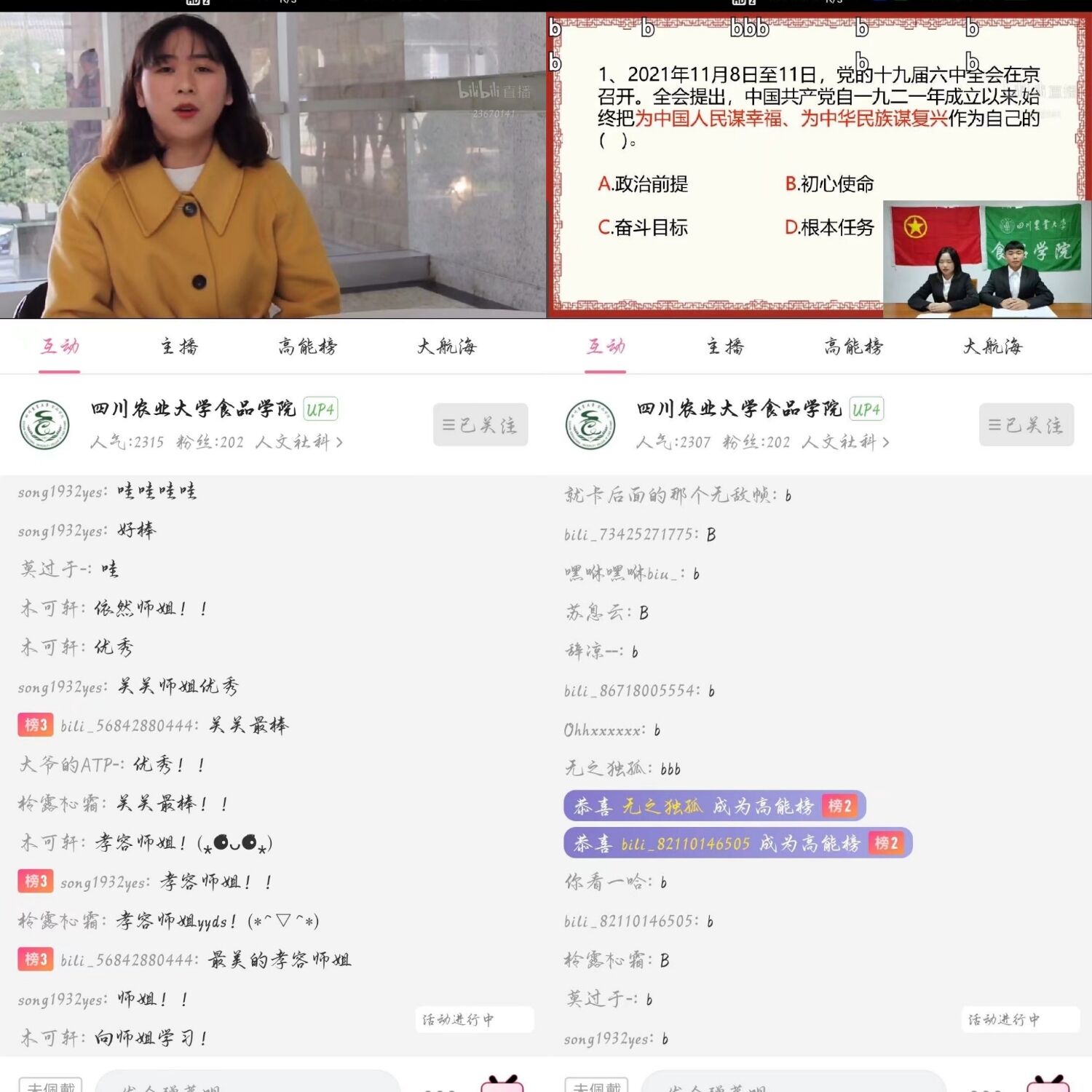 2021年11月23日16:30,必赢亚洲bwin官网“学好全会精神·奋斗点亮青春”主题示范性团日活动顺利举行。在遵守疫情防控的前提下,本次示团在必赢亚洲bwin官网官方B站平台进行线上直播。学院党委办公室副主任兼团委副书记彭小芮老师出席本次活动,累计2300余人次观看直播。活动由学院学生艺术团主持队成员游晨曦、黄可嘉主持。