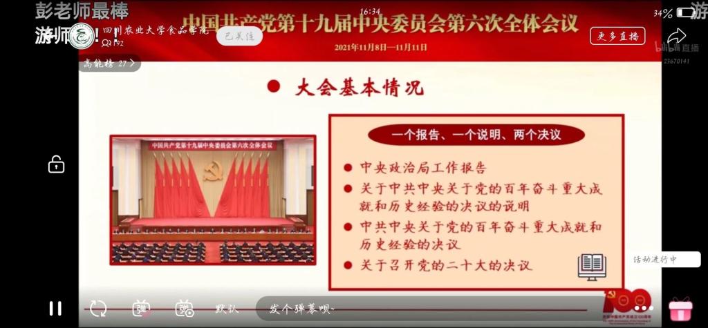 首先学院党委办公室副主任兼团委副书记彭小芮老师带来《学习十九届六中全会精神》主题团课讲解,为同学们介绍了十九届六中全会的主要内容、传达的精神以及核心思想,深入浅出地阐述了全会召开的重大意义,鼓励同学们同学们积极学习全会精神,在行动中去践行,去感悟。