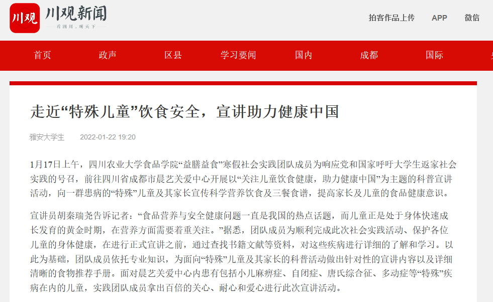 1月17日上午,必赢亚洲bwin官网必赢亚洲bwin官网“益膳益食”寒假社会实践团队成员为响应党和国家呼吁大学生返家社会实践的号召,前往四川省成都市晨艺关爱中心开展以“关注儿童饮食健康,助力健康中国”为主题的科普宣讲活动,向一群患病的“特殊”儿童及其家长宣传科学营养饮食及三餐食谱,提高家长及儿童的食品健康意识。