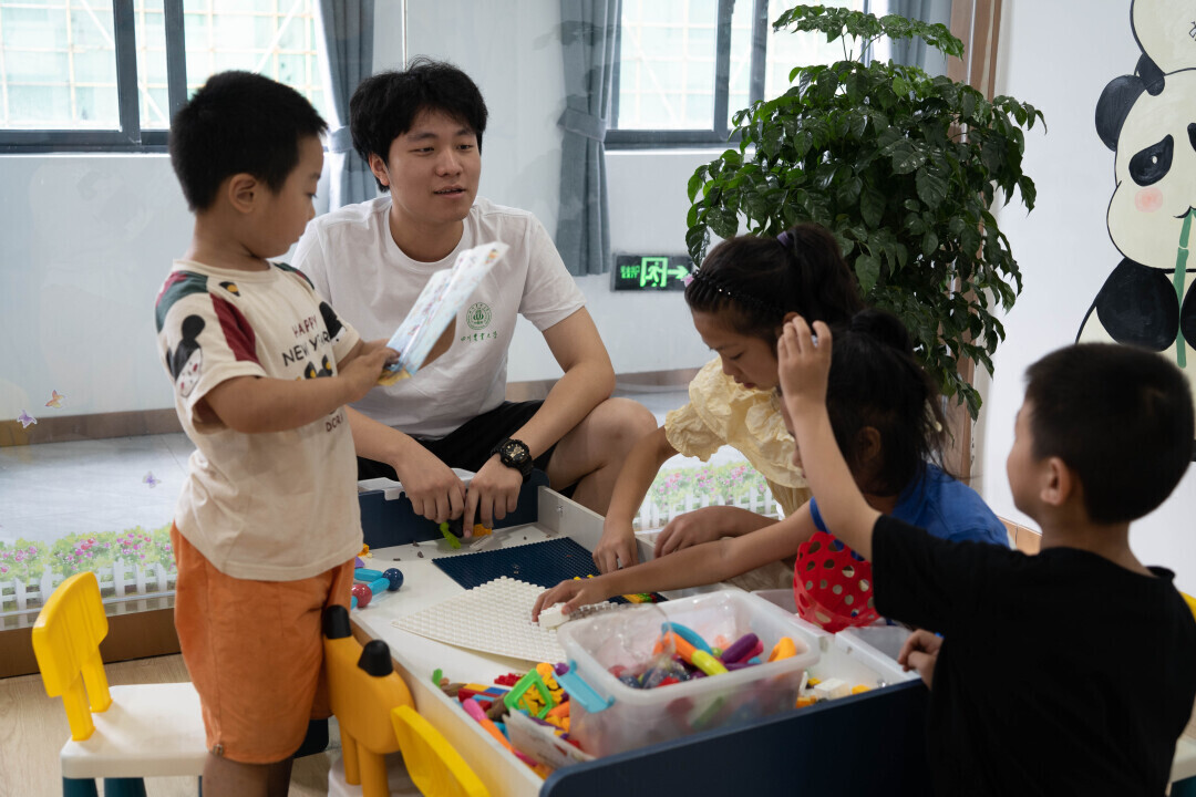 图为团队成员在宣讲课之前与孩子们进行破冰游戏。中国青年网通讯员 蔡健行 摄