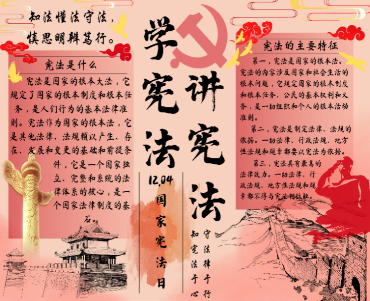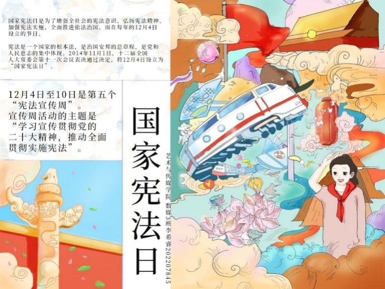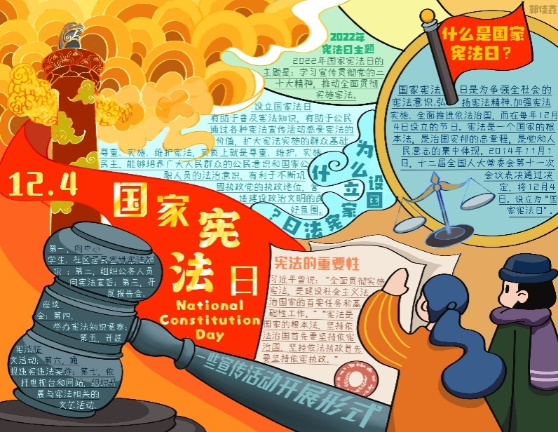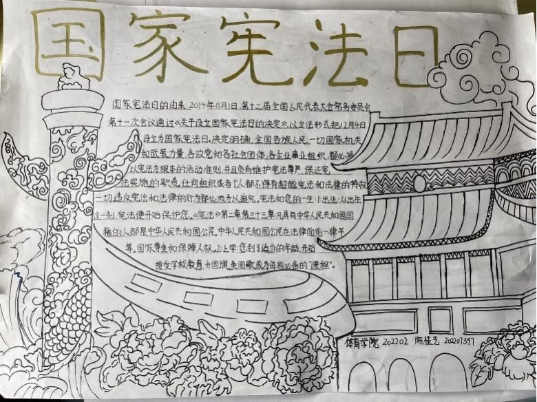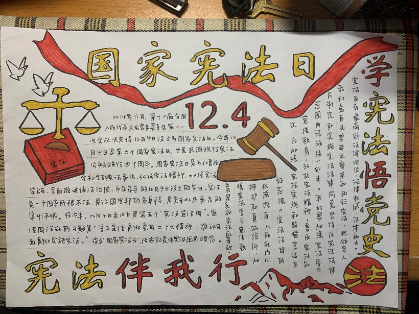 “国家宪法日”手抄报活动在12月8日开始,同学们制作了纸质版和电子版两种形式的手抄报,色彩协调,排版简洁大方,表达出了当代大学生对宪法的深刻理解与解读。在增强自我宪法意识的同时,也继承和弘扬了宪法精神。深入学习宣传宪法,大力弘扬社会主义法治精神,具有十分重要的意义。
