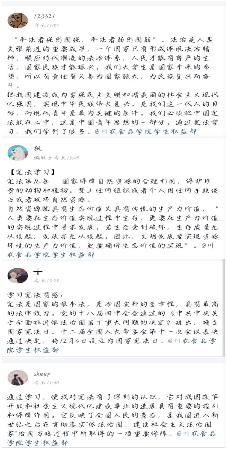 此次活动分为学习强国线上打卡和制作“国家宪法日”手抄报两个部分。11月27日起,同学们在学习强国APP上,通过阅读文章、观看视频、参加答题等方式,学习宪法和党史,并且坚持每天在动态里上传学习积分截图,发表学习宪法和党史的心得体会。同学们表示:“宪法是维系国家和民族凝聚力的根本保障,也是中国共产党执政兴国,团结全国各民族人民,建设中国特色社会主义的法制保证。通过学习,我们对宪法的内容涉及国家的政治、经济、文化、社会和对外交往等各方面的重大原则性问题和根本性问题有了更加深入的了解。”