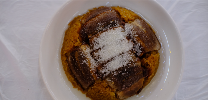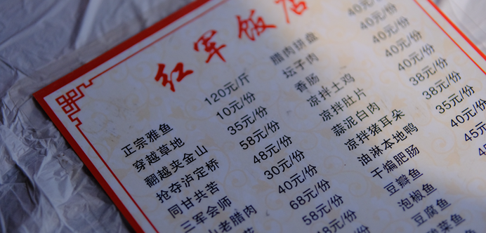 在游人如织的上里古镇磐安街,红军饭店的招牌格外显眼,不少人慕名前来。88年前,长征中的红四方面军在上里古镇经过、停留,年仅16岁的上里古镇村民彭庭先参军,在雅安名山县经历百丈关战役后,跟随长征队伍继续前行。2005年,彭庭先的儿子彭康在当年父亲参军的地方,开了这家“红军饭店”,成为宣传长征故事的一块“根据地”,为了让更多的人了解长征故事,彭康将红军长征中的经历做成菜名,如腊排骨叫“抢夺泸定桥”、炒苦瓜叫“同甘共苦”、夹沙肉叫“翻越夹金山”、烩三鲜叫“三军会师”等,以此来激发群众们的好奇心。除了在菜名上花心思,彭康还通过各种途径搜集到了关于红军长征的资料,有的甚至是从北京的档案馆里找来的。在采访的过程中,彭康向记者介绍了一道最特别的菜,但其背后的红色故事却不被人所熟知——夹金山。彭康告诉记者:提起红军长征,大家自然而然就会想到过雪山草地,但很少有人知道夹金山是红军长征以来翻越的第一座雪山。“彭康还向记者说道:”大家更常知道的是抢夺金沙江或飞夺泸定桥,但其实翻越雪山远比这艰苦的多,在世界历史上没有任何一支军队曾征服过这样的雪山,只有共产党领导的红军做到了!”