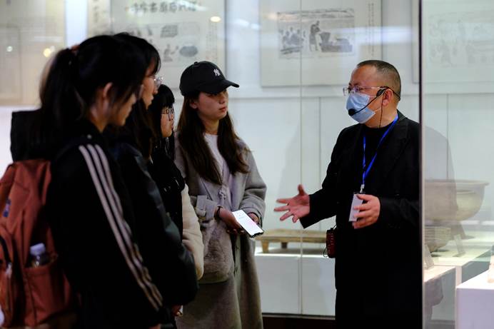 图为成都川菜博物馆馆长张辉强向团队成员介绍川菜的发展。中国青年网通讯员 万昕怡 提供