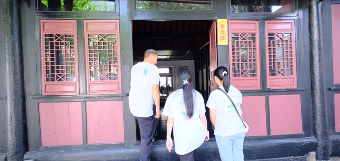 在“同乐会”会址的管理员田明俊的带领下,团队成员来到北侧厢房,参观当年毛泽东、周恩来等领袖短暂休整期间所居住的房间,房内摆放着一张老式木床,床上铺着粗布床单,放着一床被子和一个用包袱布包着衣服做成的枕头,墙上挂着蓑衣、斗笠,窗边是一张漆面已经剥落的书桌和一把木椅,整个房间陈设简单、朴实。移步东侧厅堂,图文并茂的事迹介绍吸引了大家驻足观看,革命先烈们抛头颅、洒热血,不惧牺牲的精神深深感动现场的每一个人,同时也鼓励团队成员积极赓续红色血脉,用党的奋斗历程和伟大成就鼓舞斗志、指引方向;用党的光荣传统和优良作风坚定信念、凝聚力量;用党的历史经验和实践创造启迪智慧、砥砺品格。参观完后,队员成欣表示:“有幸亲眼目睹革命领袖生活过的地方,太令人激动了,革命前辈身上艰苦奋斗、顽强拼搏的精神,值得我们当代青年学习!”