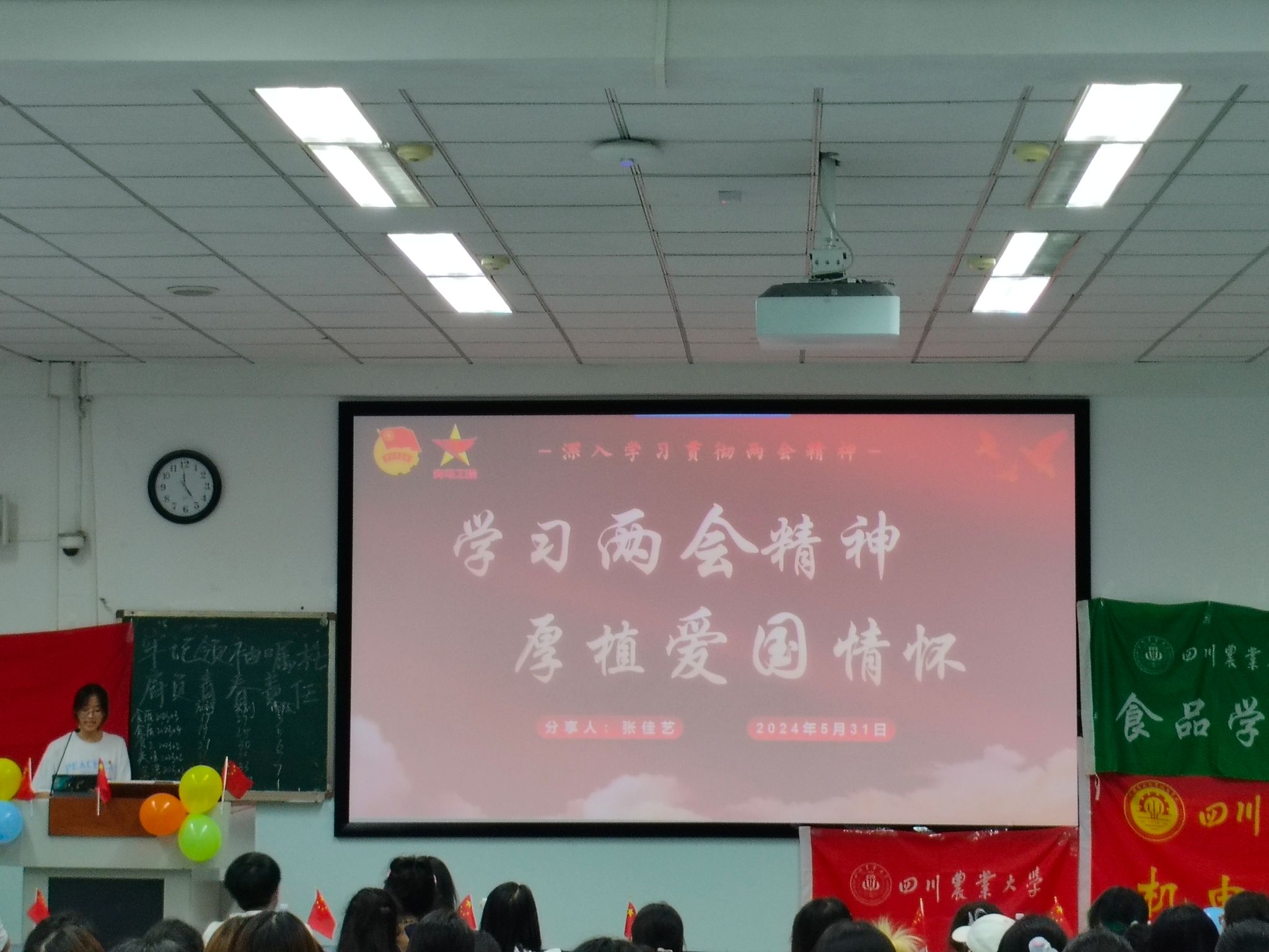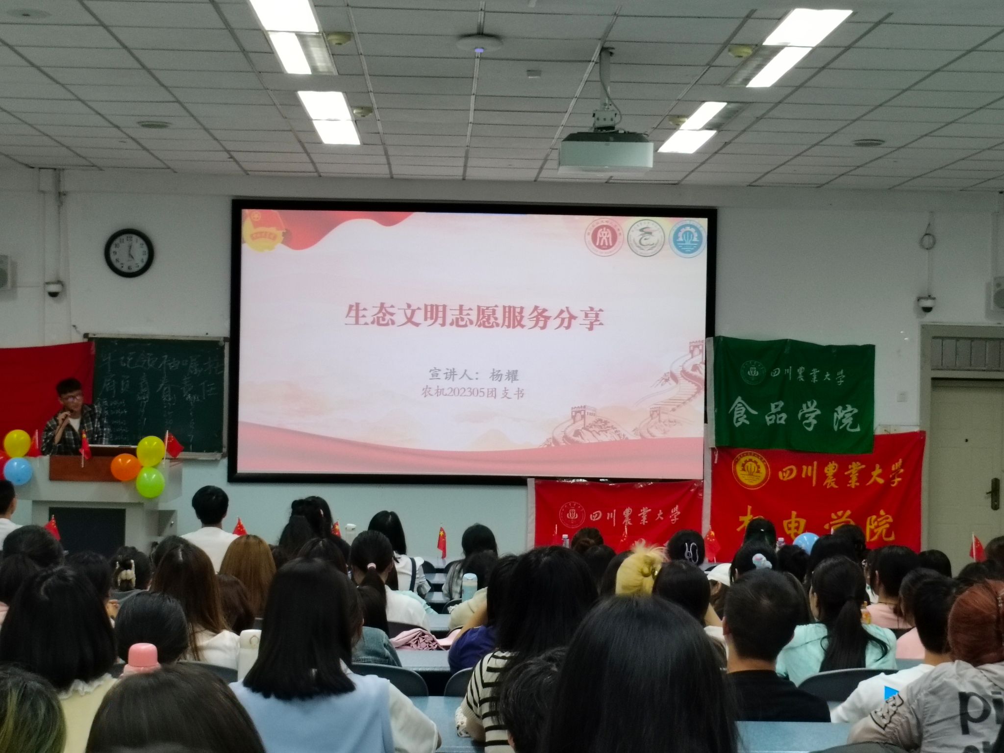 随后,由农机202305团支书杨耀进行社会实践分享。通过展示相关环境保护社会实践成果,杨耀强调绿水青山就是金山银山,呼吁同学们让绿色观念成为共识,绿色生活成为常态,绿色行动融入生活。