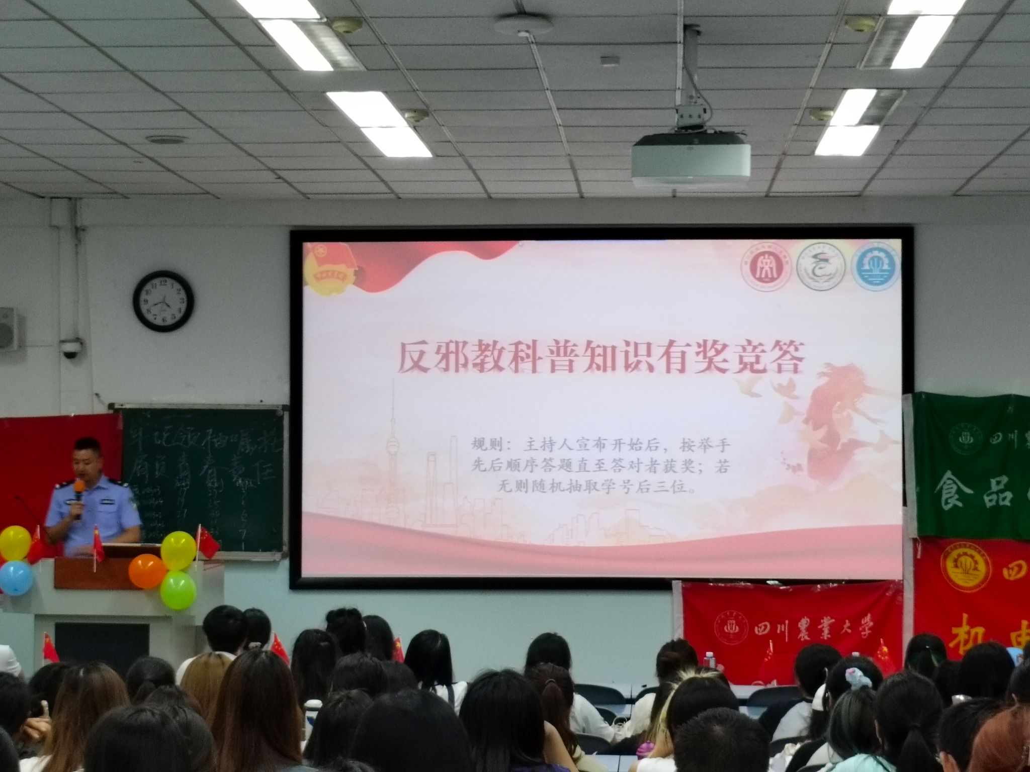 活动邀请到西城派出所陈洪勇警官进行知识宣讲。陈警官主要围绕反电信诈骗和反邪教两方面进行讲解,他着重指出电信诈骗形式多样,要时刻保持警惕,不轻易透露个人信息;必须坚决抵制邪教,提高识别能力,共同维护社会的和谐与稳定。此外,现场进行了反邪教知识竞答,同学们积极参与,进一步加深了对反邪教知识的掌握。