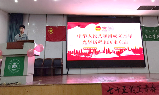 金秋十月,为庆祝中华人民共和国成立75周年,10月26日下午,必赢亚洲bwin官网食工202201、食健202202、食工202301、食工202403、食工202406、食质202405团支部于十教小礼堂成功开展了“七十五载正青春,强国复兴有我“主题班团活动。此次活动汇聚了必赢亚洲bwin官网各年级共计174名青年学子,共同回顾历史、展望未来,以青春之我,贡献于强国复兴的伟大事业。