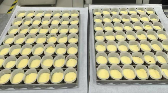 成员们分为几个小组,分离蛋清蛋黄,称量材料,煮沸牛奶,打发奶酪等准备活动。杨老师现场演示了蛋黄糊制作、蛋白打发、水浴烘焙等核心步骤,老师强调了半熟芝士口感绵密的秘诀就是过筛材料和低温水浴烘烤。在这期间,成员们时不时提出一两个疑问,例如如何判断半熟芝士是否烤制得合适?半熟芝士A粉是什么?在家如何自己制作半熟芝士?老师一一欣然解答。