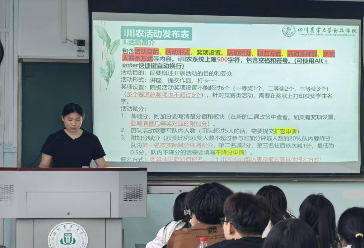 培训会在两位二课部门干事余泓瑾和王译涵的精彩配合下有序开展。首先干事余泓瑾围绕“活动报名表与加分表”“二课活动流程”以及“i川农活动发布表”三大板块展开详细讲解。她系统梳理活动发布的规范流程,重点强调活动主题的命名规则、活动简介撰写规范性,以及活动时间、人数、地点等关键信息填写的注意事项。此外,她针对活动赋分细则进行细致说明,包括基础分和附加分的计算方式、奖项设置的限制等,帮助大家规避常见错误。