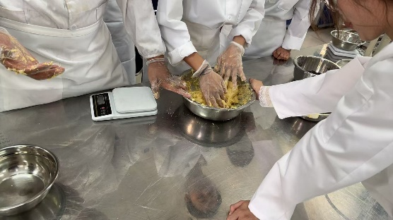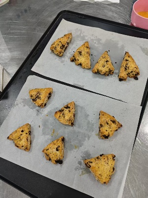 活动中,学生们分组协作,依次完成混合粉类、揉搓黄油、搅拌蛋奶液、冷藏定型等步骤,最终将裹满奥利奥碎的司康送入烤箱。随着香气弥漫,金黄酥脆的司康新鲜出炉,每位同学都收获了3-4块亲手制作的甜品。活动还特别注重操作规范与安全,提前清理实验器材、检查仪器使用,确保流程顺利。