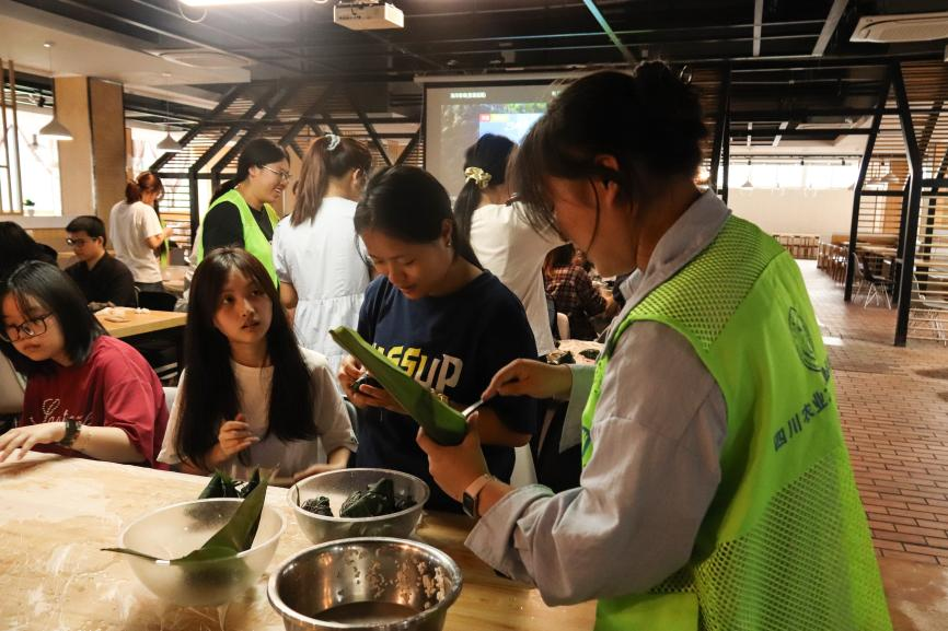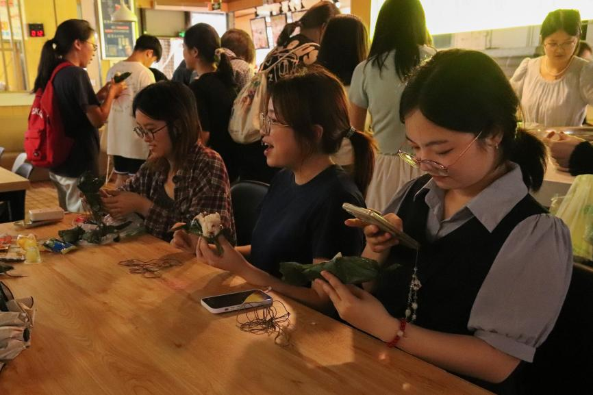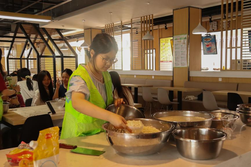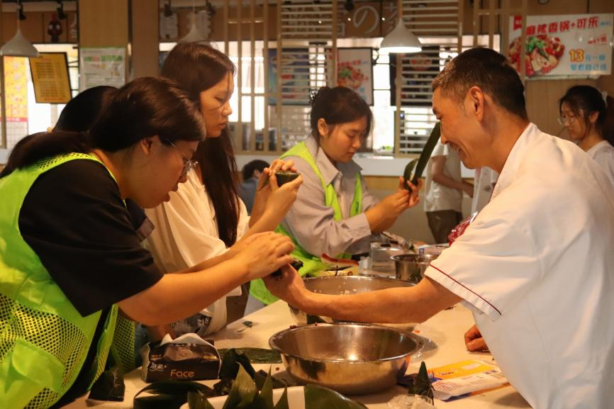 更令人惊喜的是,平日里在食堂掌勺、深受同学们喜爱的食堂叔叔也加入了指导行列。只见他宽厚的大手拿起两片翠绿的粽叶,动作行云流水,一折、一填、一压、一捆,一个棱角分明、饱满挺括的三角粽便魔术般诞生,引来一片惊叹。“叔叔,快教教我那个角怎么收!”同学们和工作人员都纷纷凑过来。他憨厚一笑,耐心地放慢动作,一遍遍演示着指尖的力道与粽叶包裹的诀窍,他那带着乡音的讲解格外亲切,仿佛在传授一道家传的拿手菜。