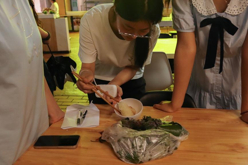 初时指尖略显迟疑,粽叶似乎难以驯服,但在彼此鼓励与工作人员悉心点拨下,手法渐入佳境。“别急,看这里,叶尖要对折成漏斗状,米不要填太满…”一位工作人员俯下身,用温暖而沉稳的声音讲解,手指灵巧地示范着关键步骤,手把手调整着学员手中粽叶的角度。“之前没有尝试过包粽子,今天能亲自体验超级开心,工作人员也很耐心!”参与活动的薛照媛同学激动地说道。