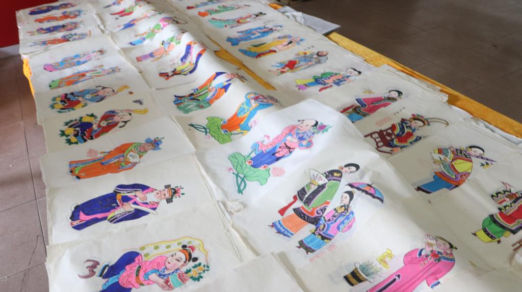 李德敬老师介绍说,绵竹多竹也近山,造纸业也曾和年画相依一同繁荣。以往的绵竹年画都采用绵竹特有的粉笺纸作画,颜料也是匠人们用天然矿石或自然植物特制,而现在,绵竹年画的市场早已不比几十年前,再采用粉笺纸和特制颜料则会造成极高的成本,因此,一般都采用普通的宣纸和国画颜料制作。