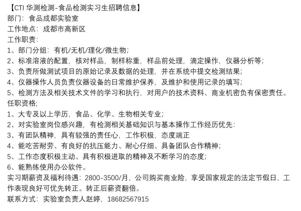 导航痕迹 必赢亚洲bwin官网 必赢亚洲bwin官网 首页 就业之窗 就业信息 正文 就业信息 就业指导 CTI华测检测-食品检测实习生招聘信息 2022年05月16日 16:34 点击:[] 上一条:四川省蜀福香食品有限责任公司招聘 下一条:梅花集团校园招聘 【关闭】