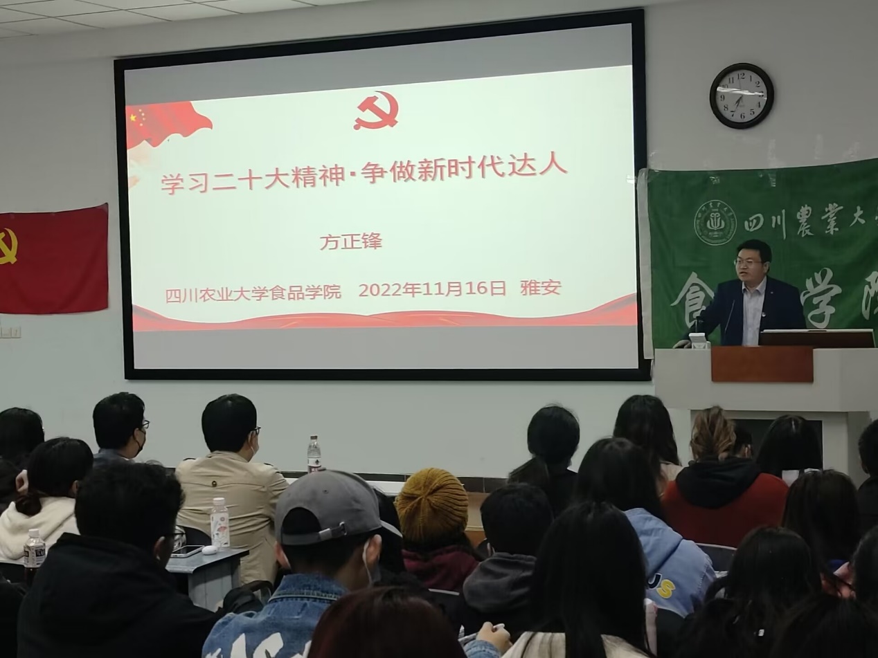 学院领导干部带头学习、宣讲党的二十大精神。11月15日,党委书记秦文以党的二十大报告中关于科技、人才、教育的有关论述为全院教工党员讲专题党课,从高等教育的世界形势,中国发展现状等方面展开剖析,要求全院教职工从报告的思想创新、理论创新、行动创新中认真领悟贯彻新时代新征程的使命任务,立足“立德树人”根本任务,在新时代的新赛道中,抓住新机遇,做出新贡献,打开新天地。11月16日,面向全院学生党员、发展对象、入党积极分子,院长方正锋以“学习二十大精神,争做新时代达人”为主题,通过问答和讨论的形式带领同学们深刻领悟党的二十大报告的精髓要义,要求新“食”代新青年要在“真学”上下功夫、在“深思”上见真章、在“笃行”上动真格,把党的二十大精神的学习成果转化为实际行动。10月25日,学院党委副书记汤瑞瑞为全体入党积极分子带来《中国共产党的性质、宗旨、组织原则》专题党课,结合二十大报告中对青年的期待和号召,要求入党积极分子们坚定不移听党话、跟党走,努力践行全心全意为人民服务的宗旨,立志做有理想、敢担当、能吃苦、肯奋斗的新时代好青年。学院辅导员集体备课,以“新征程上的新使命”为主题面向500多名青年学子做讲座,讲述以老一辈和新一代川农人为例,深情讲述了他们在不同时代以兴农报国为己任,在广袤的祖国大地奉献青春的动人故事,鼓励新时代的川农青年应当主动对接国家重大战略需求,以昂扬姿态把青春理想投入国家与民族的伟大事业中。