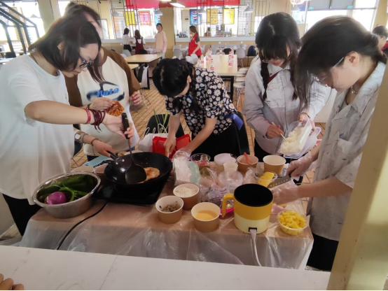 5月7日下午,决赛现场,参赛队员们各司其职、分工明确,或是洗择切煮或是刷剁炒剪,使用鲜虾、鱼头、菠萝、青菜、西兰花等各种新鲜食材进行创意菜品创作,比赛现场香气四溢、直扑味蕾。随后,各自队长进行了菜品简介和推介,从“创意大盘鸡”到“菠萝炒饭配薄荷炒猪颈肉”,从“白玉包万象”到“翡翠玛瑙白玉”,同学们将自己对“大食物观”的理解以及所学的食品工艺学、食品营养与健康相关知识融入菜品创作,通过精美的摆拍、诗意的菜名,呈现出各自的菜品,并得到评委老师从色、香、味、意、形、营养、创新等方面的专业点评与建议。