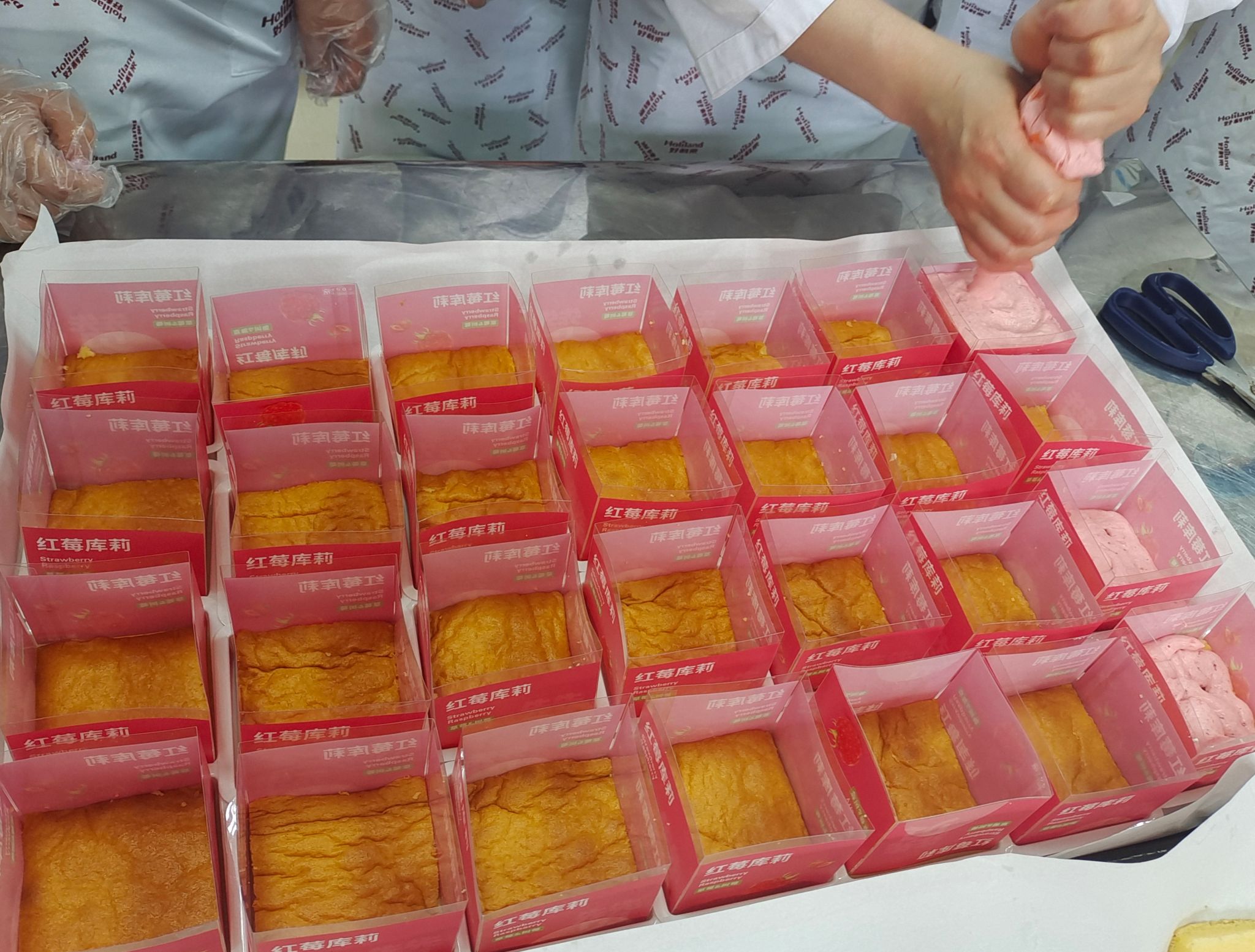 本次培训带给同学们全新的体会,重新领悟烘焙之意。培训老师向同学们讲解道:“仅仅是打发蛋清,不同蛋糕品类都有不同的讲究。”对烤制一个成功的蛋糕来说,把握蛋清打发的度很重要。打发过度导致蛋白霜呈棉絮状,蛋白霜难以和蛋黄面糊混匀,打发不到位会导致烤好的蛋糕胚失去应有的蓬松度,质感较硬,口感较差。来参加培训的同学表示:“看起来简单的奶油造型,亲手挤才知道操作起来并不容易,手一抖形状就歪了。”可见,烘焙并不是简单的原材料称量和混匀,每一步操作均有背后的原理。