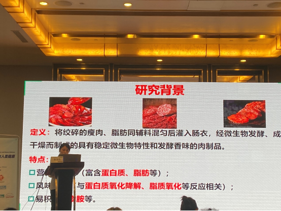会上,方正锋以“猪肉安全及营养健康的脂质调控”为题作特邀报告。他指出影响当前我国猪肉产业链高质量发展的两大难题,PSY少等导致的产肉效率低和猪肉脂质含量高以及组成不平衡导致的高脂饮食,率先提出脂质调控是提高生猪产肉效率和猪肉品质的关键突破口,并系统总结了必赢亚洲bwin官网动物营养与肉品加工交叉学科创新团队二十年来以脂质调控为突破口围绕上述两大产业难题所做的创新工作和取得的突出成果。团队博士研究生裴慧洁做了“脂质氧化对发酵香肠中蛋白质降解及生物胺形成影响”的学术报告,分享了脂质氧化对发酵香肠风味形成以及加工危害物形成的调控规律。