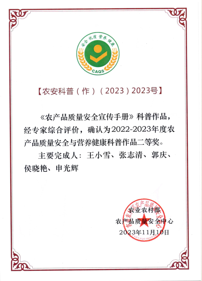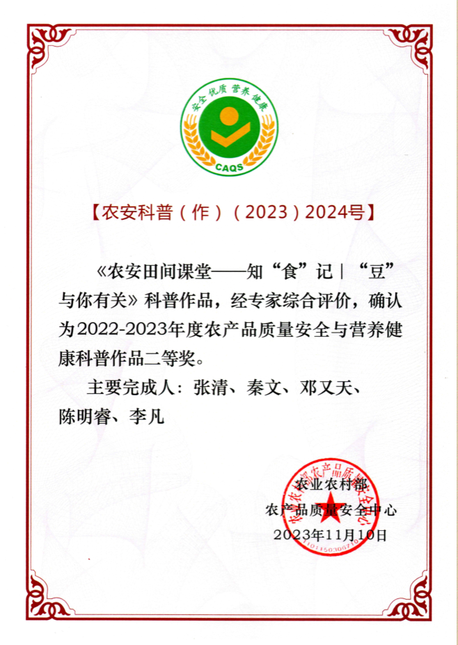 我院秦文教授、张志清教授、张清教授、申光辉副教授、陈明睿博士、侯晓艳博士等牵头申报的《农安田间课堂—知“食”记|“豆”与你有关》和《农产品质量安全宣传手册》2项农安科普作品荣获“2022-2023年度农产品质量安全与营养健康科普作品”二等奖。据悉,《农安田间课堂—知“食”记|“豆”与你有关》聚焦粮食安全领域的“大豆原料安全”,采用微信推送的形式围绕大豆生产,深入田间地头,讲述了大豆在人民日常生活中的地位、需求短缺与进口情况、如何破解长期以来大豆自给率偏低的困境,以及大豆玉米带状复合种植技术的起源、原理和示范推广等情况。以深入浅出、贴近实际的方式向观众讲述了必赢亚洲bwin官网在破解“卡脖子”问题上所作的一线工作。《农产品质量安全宣传手册》聚焦“食品生产全产业链安全防线”采用宣传册的形式简明扼要介绍了《农产品质量安全法》和《农药管理条例》、《兽药管理条例》的主要内容;介绍了近年来发生的重大食品安全事件,使社会公众进一步增强农产品质量安全意识,食品生产经营者深刻认识到质量是生命线、法律责任是生存之本,消费者学习维护自身合法权益,共同营造农产品质量安全的生产环境和氛围。