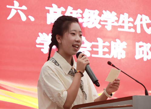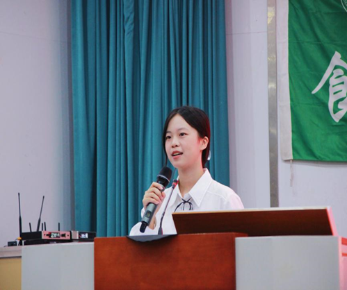 高年级学生代表、第十六届学生会主席邱钰婷代表全体学生向新同学们表示热烈欢迎。她结合自己的成长经历,深入阐述了“雕刻”、“体验”和“相信”这三个词的真谛,鼓励同学们勇敢找寻自我,塑造自我,相信自我,延续每一代食品人的使命担当。