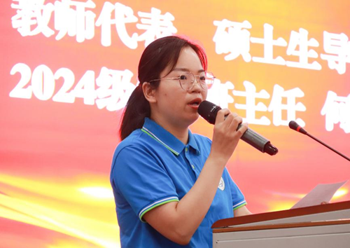 教师代表、硕士生导师、食工202402班主任何利副教授在讲话中提出了四个感恩:感恩祖国的强大,感恩学校提供的优质环境,感恩自己始终如一的坚持,感恩父母无私的支持,及感恩师兄师姐的热心帮助,寄语新同学们,要勇于突破自我,为热爱而奋斗;勇于提问,敢于质疑,用汗水书写人生的华章。她鼓励大家要珍惜这段求学时光,把握机会,不断挑战自我,努力成长,为未来打下坚实的基础。