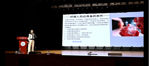 活动中,刘琼以《中国白酒的基础知识》为题为同学们带来了一场别开生面的品酒知识讲座。她概述了中国十二大种香型白酒,揭示出白酒背后的文化底蕴与匠心精神;并从品酒方式、品酒条件等方面详细介绍白酒品鉴的基本知识,强调环境因素和品酒员能力素质对鉴定酒品质量的多重影响,让同学们感受到了每一滴佳酿背后的故事与温度。许多同学对活动赞不绝口,表示品酒课堂上所学到的知识可以用在学院开设的食品感官评价课程中,并期待学校举办更多类型的企业进校活动。