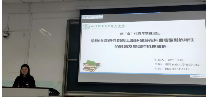 赵宁以《酸胁迫适应性对酸土脂环酸芽孢杆菌嗜酸耐热特性的影响及其调控机理解析》为题,从选题背景、关键科学问题、研究内容和目标、以及研究结果等方面进行了系统介绍。研究在明确酸土脂环酸芽孢杆菌中酸胁迫适应性响应特性的基础上,从细胞生理、基因转录及蛋白表达水平对该特性进行了系统解析。研究成果有助于完善酸土脂环酸芽孢杆菌嗜酸耐热特性理论基础,且可为该菌防控和检测措施开发提供生物标志物,具有重要理论和实践意义。