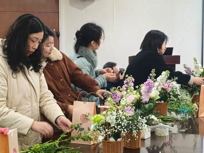 活动伊始,花艺师详细讲解花艺知识与实用插花技巧,为大家后续创作奠定基础。随后的DIY插花体验环节,现场氛围热烈。教职工们充分发挥创意,精心修剪、搭配花材,将玫瑰、风信子、雏菊等变成一盆盆造型各异的花艺作品。作品展示与分享环节,大家积极展示成果,交流心得,现场欢声笑语不断,最后在合影留念中圆满结束活动。