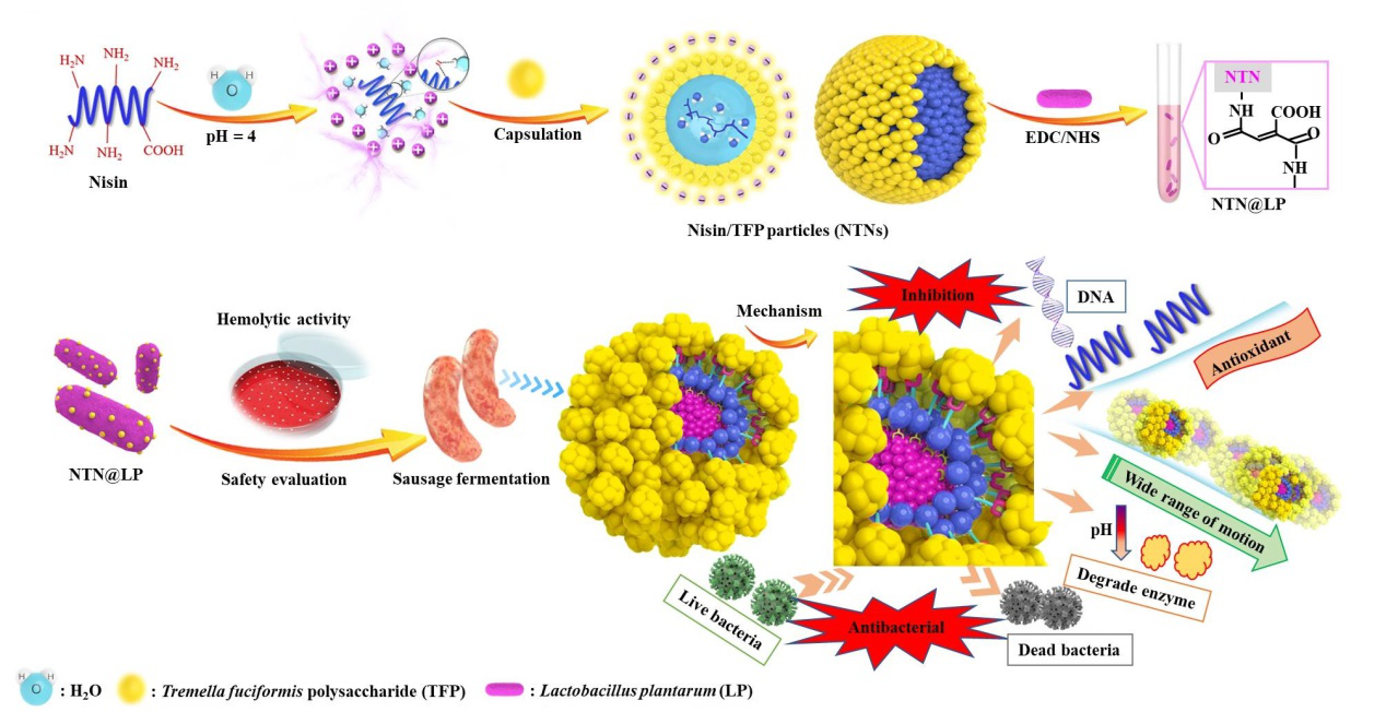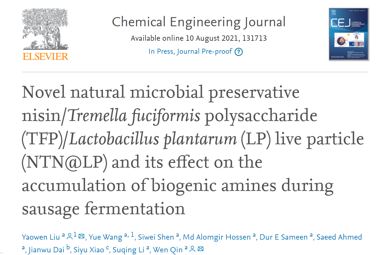 近日,必赢亚洲bwin官网在工程领域国际顶级期刊《Chemical Engineering Journal》(《化学工程杂志》,中科院一区TOP,IF=13.273)在线发表了论文《新型天然微生物保鲜剂乳酸链球菌肽/银耳多糖/植物乳杆菌及其对香肠发酵过程中生物胺的影响》(Novel natural microbial preservative nisin/Tremella fuciformis polysaccharide (TFP)/Lactobacillus plantarum (LP)live particle (NTN@LP) and its effect on the accumulation of biogenic amines during sausage fermentation)。这是我校食品学科首篇IF大于10分的研究性文章。