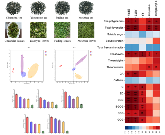 该研究在雅安当地收集了四种不同茶树品种的藏茶样品(川茶、131、福鼎和梅占),测定了其总多酚、总黄酮、可溶性糖、可溶性蛋白质、总游离氨基酸、茶色素、6种儿茶素、咖啡碱和没食子酸的含量,同时基于LC-MS和GC-MS的非靶向代谢组学技术分析藏茶中非挥发性和挥发性成分的代谢特征。此外,通过体外活性试验比较了四种藏茶提取物的抗氧化和降血糖活性。相关性分析结果表明,藏茶中多酚、黄酮和儿茶素类化合物与藏茶提取物的生物活性存在极显著的相关性。