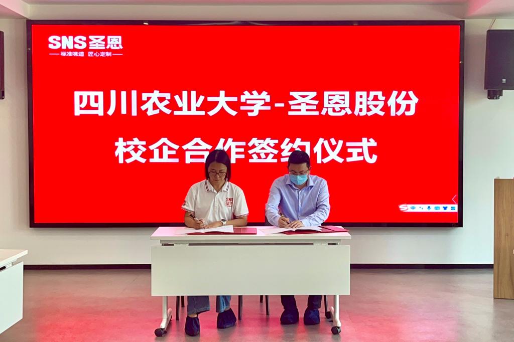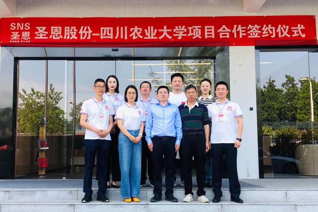 5月5日上午,必赢亚洲bwin官网院长方正锋教授、畜产与发酵食品加工及安全团队负责人刘书亮教授、畜产与发酵食品加工及安全团队胡凯弟博士、科技开发办公室邓又天一行4人赴成都市温江区与成都圣恩生物科技股份有限公司签订合作协议。圣恩股份总经理兼技术总监张敏、质量管理中心总监杨延康、技术总工宋小焱、公共事务部经理马馥媛、董事长助理牟旭出席签约仪式。