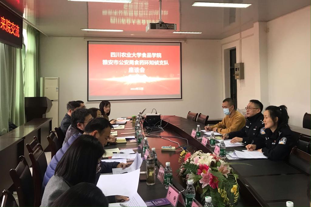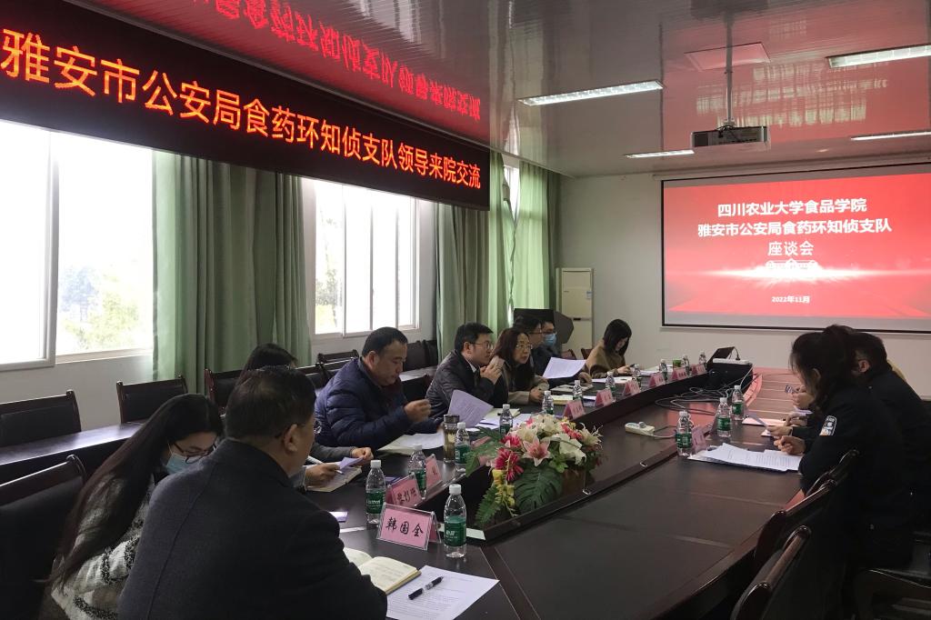 11月16日,雅安市公安局食品药品环境知识产权犯罪侦查支队支队长陈瑾、政委黄珊、民警王怡轸一行来校,就加强院校与公安食品、药品、环境和知识产权犯罪侦查信息化和数据化战略合作与必赢亚洲bwin官网进行交流。必赢亚洲bwin官网党委书记、食品加工与安全研究所所长秦文教授,院长方正锋教授出席座谈会,学院各科技服务团队教师代表参会。